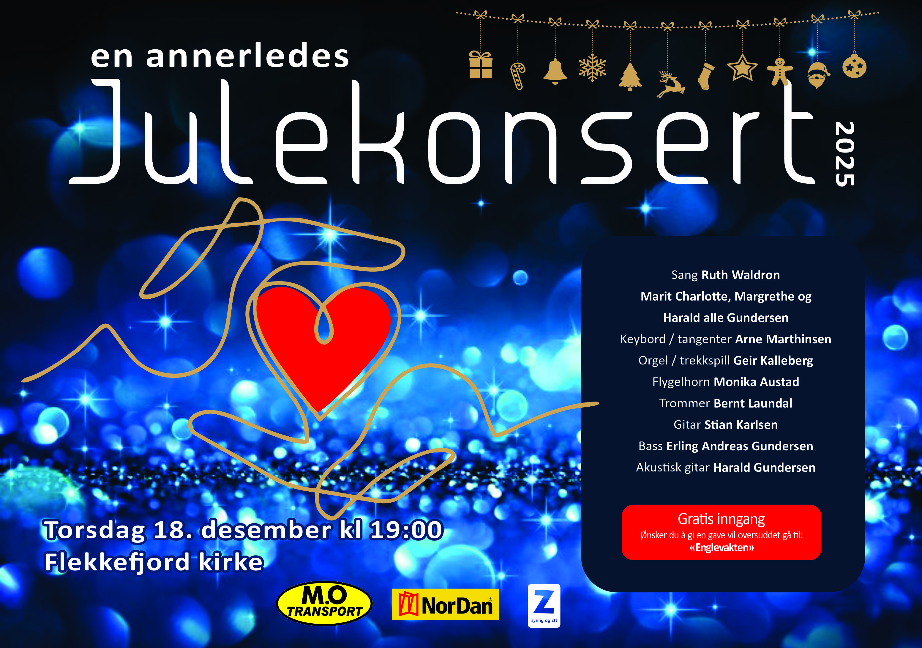 Sangerne Marit Charlotte, Margrethe og Harald Gundersen, sammen med Ruth Waldron, Erling Andreas Gundersen, Stian Karlsen, Monica Austad, Arne Marthinsen, Bernt Laundal og Geir Kalleberg, holder siste konserten i Smaaabyen før jul i Flekkefjord. Denne konserten har samlet fullt hus de siste årene, og artistene sitt ønske om å formidle noe nært og viktig har satt spor i Flekkefjord og omegn.